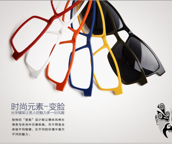 “變臉”系列設(shè)計亮點:一副鏡架搭配不同顏色的眼鏡框,有灰綠色、亮黑色、黃色、藍色、白色、紅色、橙色,不僅有造型的作用,其中灰綠色、亮黑色還有偏光的功能,時尚多變,功能齊全,操作簡單,外框采用“強力磁吸附”原理固定,只需將外框靠近鏡框,即可將外框固定在鏡架上,瞬間完成鏡架變身,你可以根據(jù)不同的場合,不同的服飾,也可以根據(jù)您的心情隨心所欲的選擇鏡框,玩轉(zhuǎn)時尚,打造不一樣的自己。