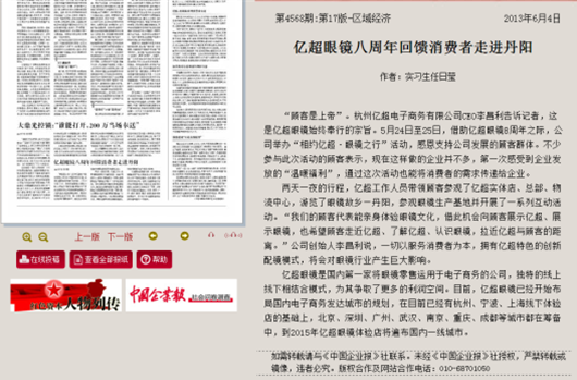 億超眼鏡的飛速發(fā)展和創(chuàng)新經(jīng)營模式,得到了媒體的廣泛關(guān)注,先后獲新浪、騰訊、每日商報等權(quán)威性報刊媒體的報道。