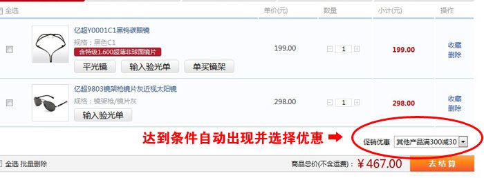 示例:下面是配鏡和近視太陽鏡,總價(jià)超過300元,滿足條件,系統(tǒng)自動(dòng)選擇滿減活動(dòng)。