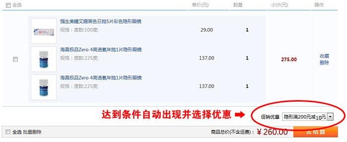 隱形眼鏡(包括隱形眼鏡、護(hù)理液、伴侶盒、雙聯(lián)盒、潤眼液、自動(dòng)清洗器),購物車中此類商品總價(jià)滿200元,系統(tǒng)自動(dòng)減10元!滿300元,系統(tǒng)自動(dòng)減20元!