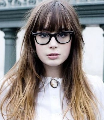 棕色長發(fā)與齊眉劉海的發(fā)型本身會(huì)讓臉型看上去比較小,而大框的鏡架則更加襯托出臉的較小,強(qiáng)烈的視覺沖突反給人一種非主流的感覺,個(gè)性美十足。